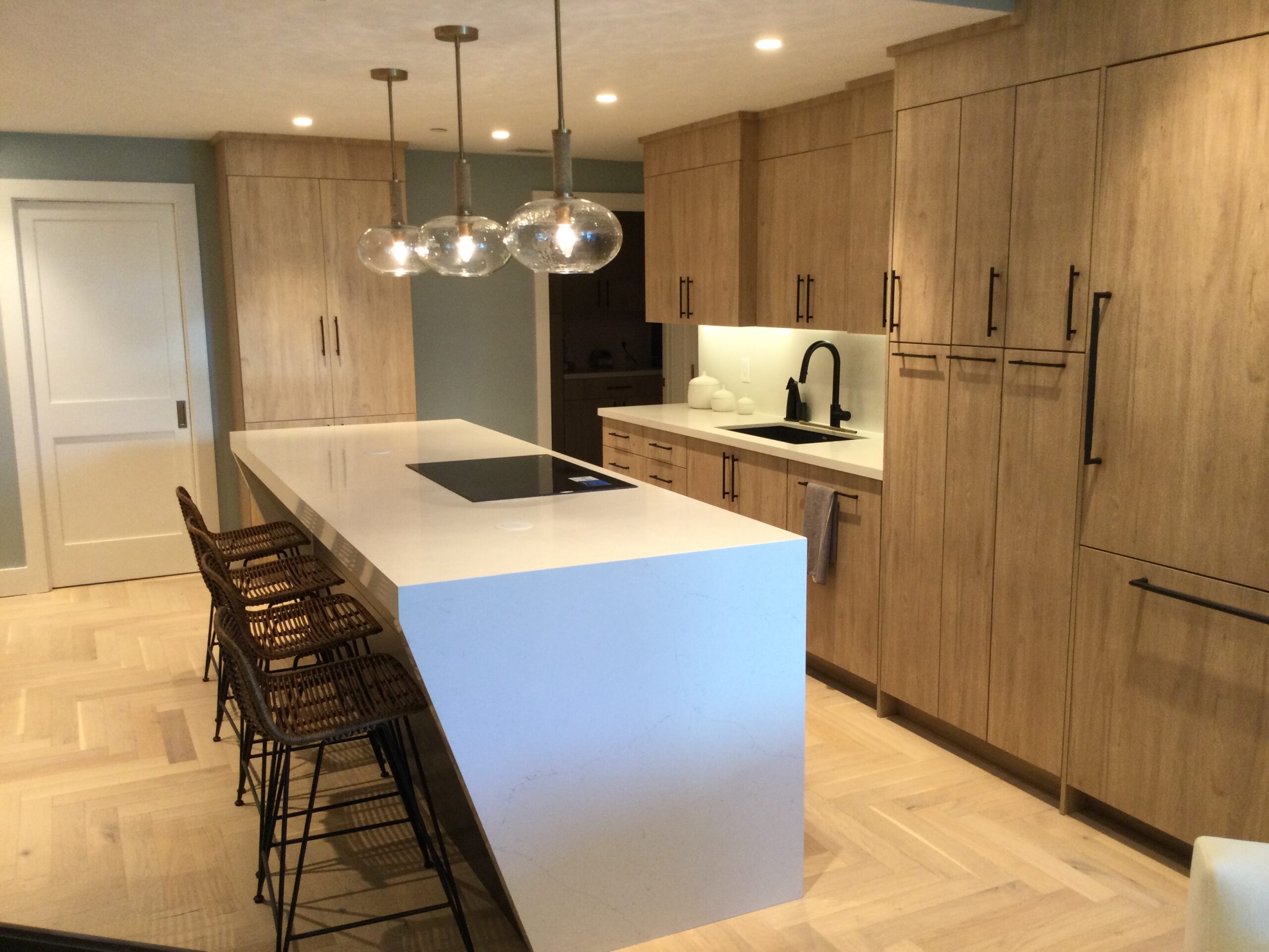 Contemporary Kitchen Featuring Tapered Waterfall Countertops