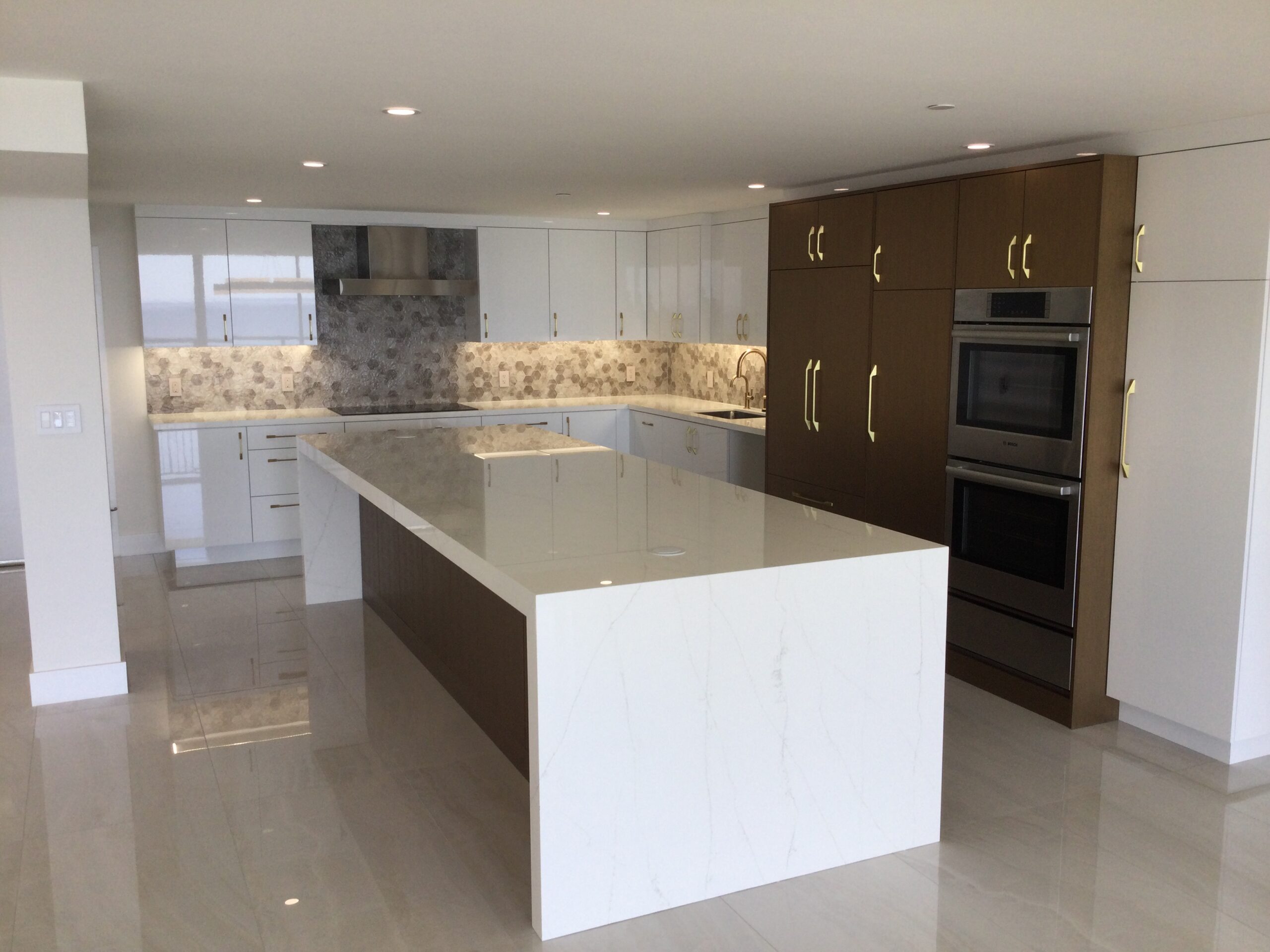 Contemporary Kitchen Featuring Quartz Island, Integrated Stainless Appliances, and Gloss Cabinetry